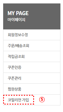 회원가입 후, 로그인이 된 상태에서 마이페이지로 이동하면 좌측과 같은 메뉴가 있는데, 가장 아래 부분에 '코밀리언 가입' 메뉴가 있습니다.