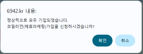 가입 정보를 모두 기입하신 후 '확인'을 클릭하면 아래와 같은 알람창이 표시됩니다.