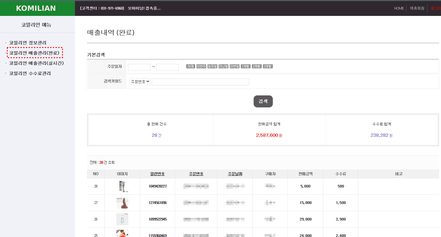 좌측메뉴에서 '코밀리언 매출관리(완료)'는 소비자의 구매결정이 완료된 메출 목록입니다.